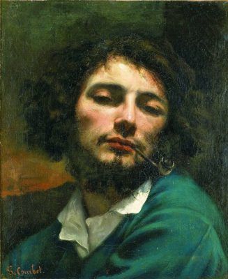 His first works were an Odalisque inspired by the writing of Victor Hugo and a Lélia illustrating George Sand, but he soon abandoned literary influences, choosing instead to base his paintings on observed reality. Among his paintings of the early 1840s are several self-portraits, Romantic in conception, in which the artist portrayed himself in various roles. These include Self-Portrait with Black Dog (c. 1842–44, accepted for exhibition at the 1844 Paris Salon), the theatrical Self-Portrait which is also known as Desperate Man (c. 1843–45), Lovers in the Countryside (1844, Musée des Beaux-Arts, Lyon), The Sculptor (1845), The Wounded Man (1844–54, Musée d’Orsay, Paris), The Cellist, Self-Portrait (1847, Nationalmuseum, Stockholm, shown at the 1848 Salon), and Man with a Pipe (1848–49, Musée Fabre, Montpellier).